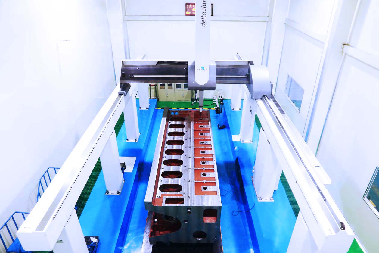 德國溫澤橋式測量機,MPEE:(3.6+L/300)μm,可實現1500*3000*1200范圍內產品的形位尺寸單點測量。 圖上8缸大排量柴油發動機正在檢驗